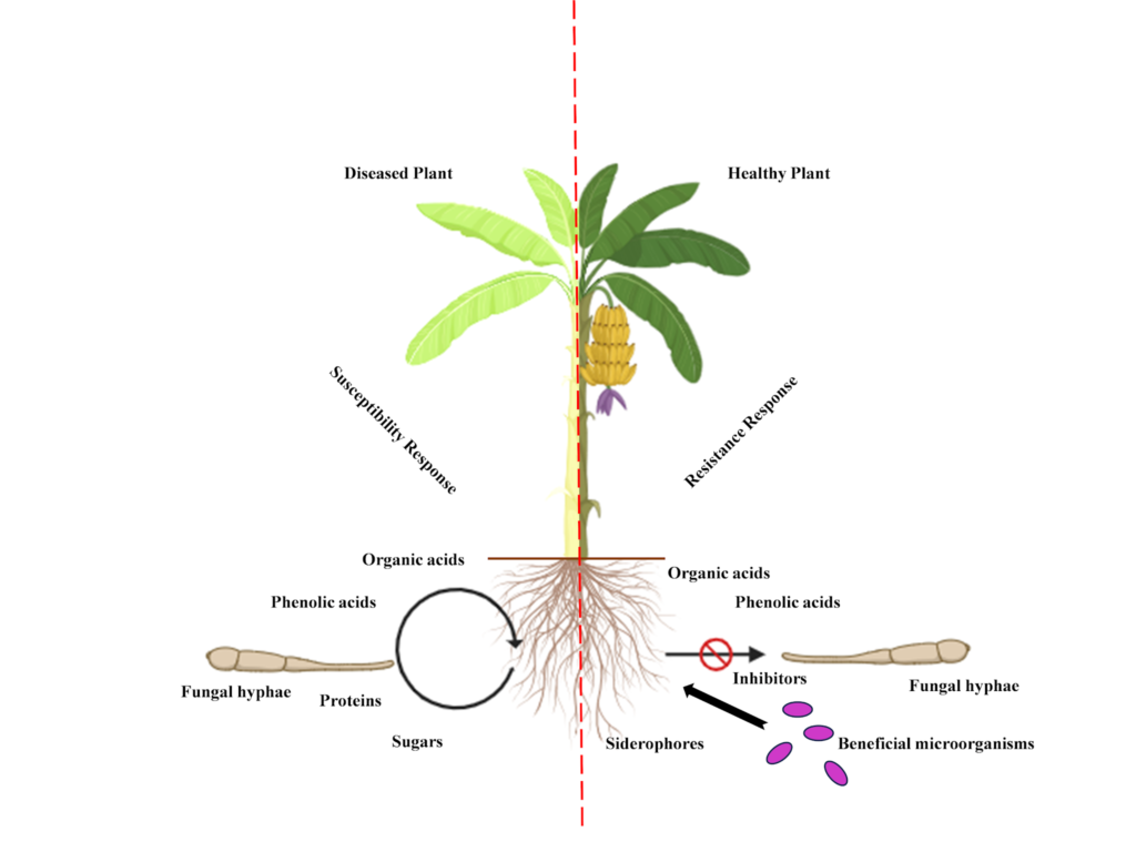 Comprehensive chemical profiling of banana root exudates across cultivars requires full-spectrum metabolomics to capture diverse metabolites. Comparing resistant and susceptible cultivars can reveal compounds linked to defense or susceptibility, while assessing their thresholds, stability, and persistence in soil is essential. Functional validation must determine whether pathogen recognition relies on a single molecule or a combinatorial chemical fingerprint. This distinction is critical for understanding signaling mechanisms. Insights gained could guide development of soil amendments with synthetic inhibitory compounds. Additionally, studying how exudates shape the soil microbiome may uncover beneficial microbes that suppress pathogens, supporting sustainable, systems-level disease management strategies.