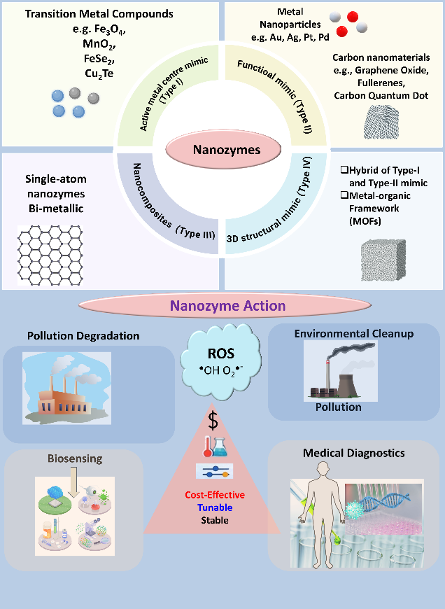 Nanozymes: From Enzyme Mimicry to Real-World Applications: The groundbreaking discovery of intrinsic peroxidase activity (POD) for ferromagnetic nanoparticles reported in Nature Nanotechnology has led to a huge increase in research on artificial nanozymes over the past few decades. However, a fundamental question remains: How did the concept of “nanozymes” gain popularity in the scientific community, and what is the underlying mechanism that enables these tiny nanozymes to replicate the catalytic behaviour of natural enzymes?   The term “nanozymes” refers to nanomaterials that mimic the catalytic function of natural enzymes, such as Horseradish peroxidase, by providing a high surface-active site, including a metal centre, a defect, or edge sites, where the substrate can adsorb and undergo catalytic transformation. Similar to the natural enzymes, these artificial enzymes primarily operate through an electron transfer mechanism. Artificial nanozymes, particularly those on metal-based surfaces like Fe, Cu, or Ni, facilitate redox reaction by undergoing a reversible change in oxidation state (e.g., Fe2+/Fe3+, Cu+/Cu2+), therefore enabling electron transfer efficiently. This reversible redox behaviour triggers their enzyme-mimicking activity, allowing their use as a catalyze the reactions such as H2O2 decomposition, generation of reactive oxygen species. These highly reactive intermediates are unstable and subsequently oxidize the target substrate, such as TMB/OPD. The oxidation of these substrates can be monitored by observing the color change of the oxidized product. This colorimetric sensing strategy serves as the foundation for the detection of a wide range of biomolecules and heavy metals. The catalytic efficiency of these nanozymes in comparison to natural enzymes can be quantitatively measured using the Michaelis-Menten kinetics. The key Michaelis-Menten parameters, such as Michaelis constant (Km), maximum reaction velocity (Vmax), and turnover number (Kcat), provide insight into substrate affinity, catalytic capacity, and overall enzymatic performance. Artificial nanozymes offer the advantage of tunability of their physicochemical properties, such as size, shape, and composition, enabling optimization of their catalytic performance. Although these artificial nanozymes generally offer lower substrate specificity than natural enzymes, they offer significant advantages such as superior stability, cost-effectiveness, and the ability to work under harsh conditions. These advantages make them a promising candidate for a wide range of applications, including chemical sensing, environmental remediation, and biomedicine.