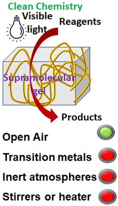 My research at Department of Chemical Sciences, Indian Institute of Science Education and Research (IISER) Kolkata focusses on development of designer amino acids analogues and peptide mimetics as supramolecular gelator for reaction engineering and visible-light organophotocatalysis with low-cost starting materials and open air. We design and synthesize chemically inert peptide mimetics that are capable of forming self-assembled gels in diverse solvents in the presence of various reactants as well as reagents. Our goal is to develop synthetic gelator that have no chromophore system and will pass the light to the photocatalysts. The instant gel should be formed by simple heating-cooling cycles and sonication, as evident by the lack of gravitational flow when the vial was inverted at ambient condition. The gel should be robust, stable for couple of days, transparent or translucent and the gel-to-sol transition temperature (Tgel) should be comparatively high. Additionally, the gel should dynamic and have significant self-healing properties i.e. when the existing structures of the gel are disrupted, new self-assembling structures spontaneously evolved. The peptide mimetic gel impedes oxygen diffusion inside the gel, protect the reagents form decays and allow air-sensitive reaction under open air conditions.