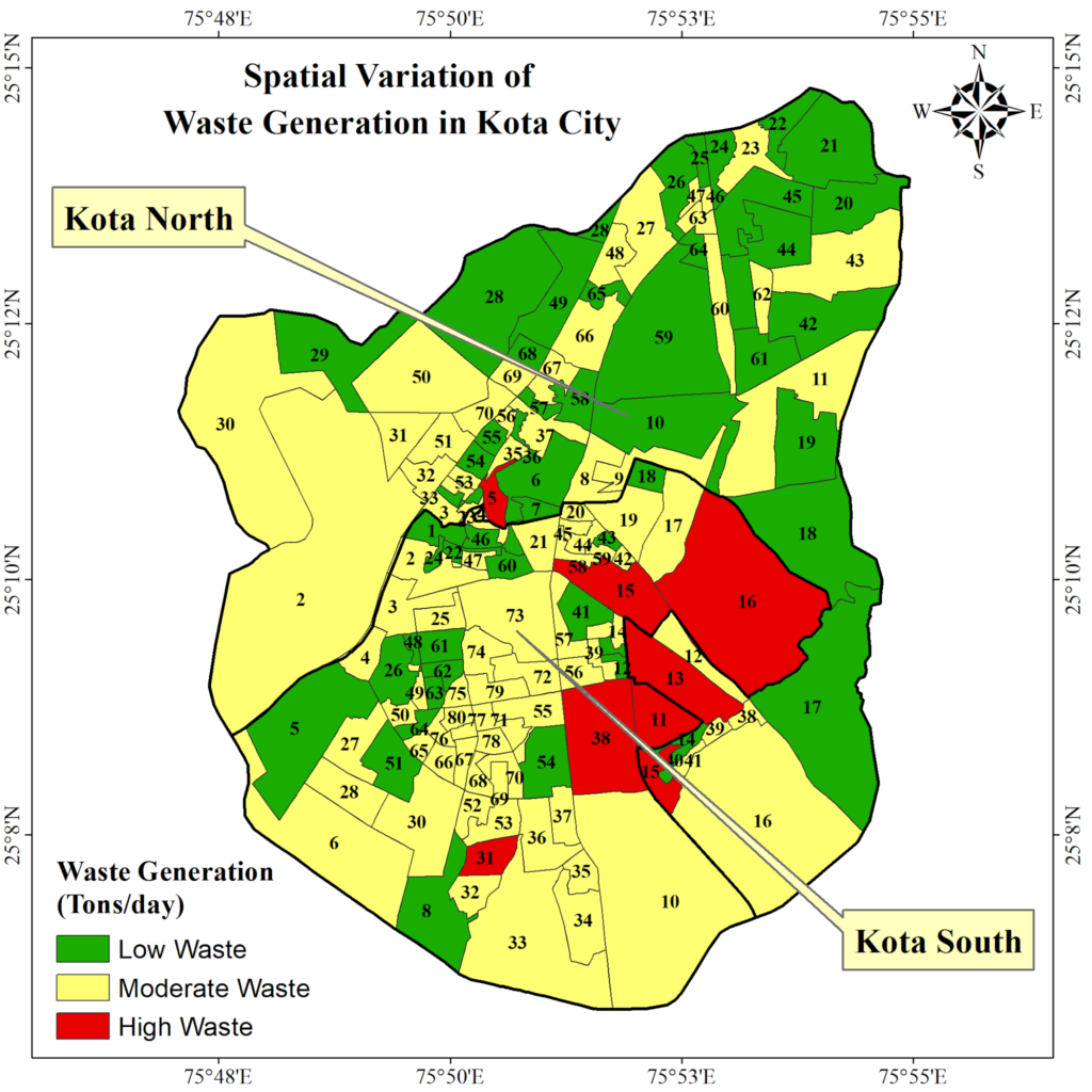Different parts of a city serve different purposes. In Kota, areas dominated by dense residential settlements and mixed land use tend to generate higher amounts of waste, while peripheral or less developed areas produce much less.